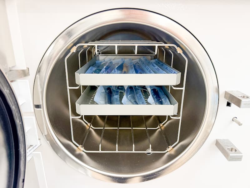 専用ボックスに収納された器具は、クラスB規格の高圧蒸気滅菌器にかけられます。この装置では、真空と蒸気の注入を交互に繰り返すことで、器具の外側だけでなく内部の細かな管や中空部分にまで蒸気を行き渡らせることができるため、ハンドピースのような複雑な器具の滅菌にも対応可能です。
